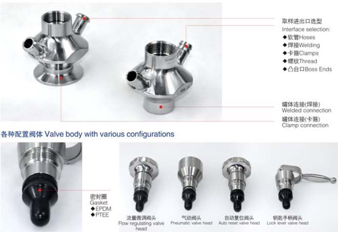 全新設計理念無菌取樣閥,滿足更高要求,美國3-A-64-00衛生認證,支持自動復位,鑰匙手柄,微調手輪,氣動,它們之前都可以相互更換。